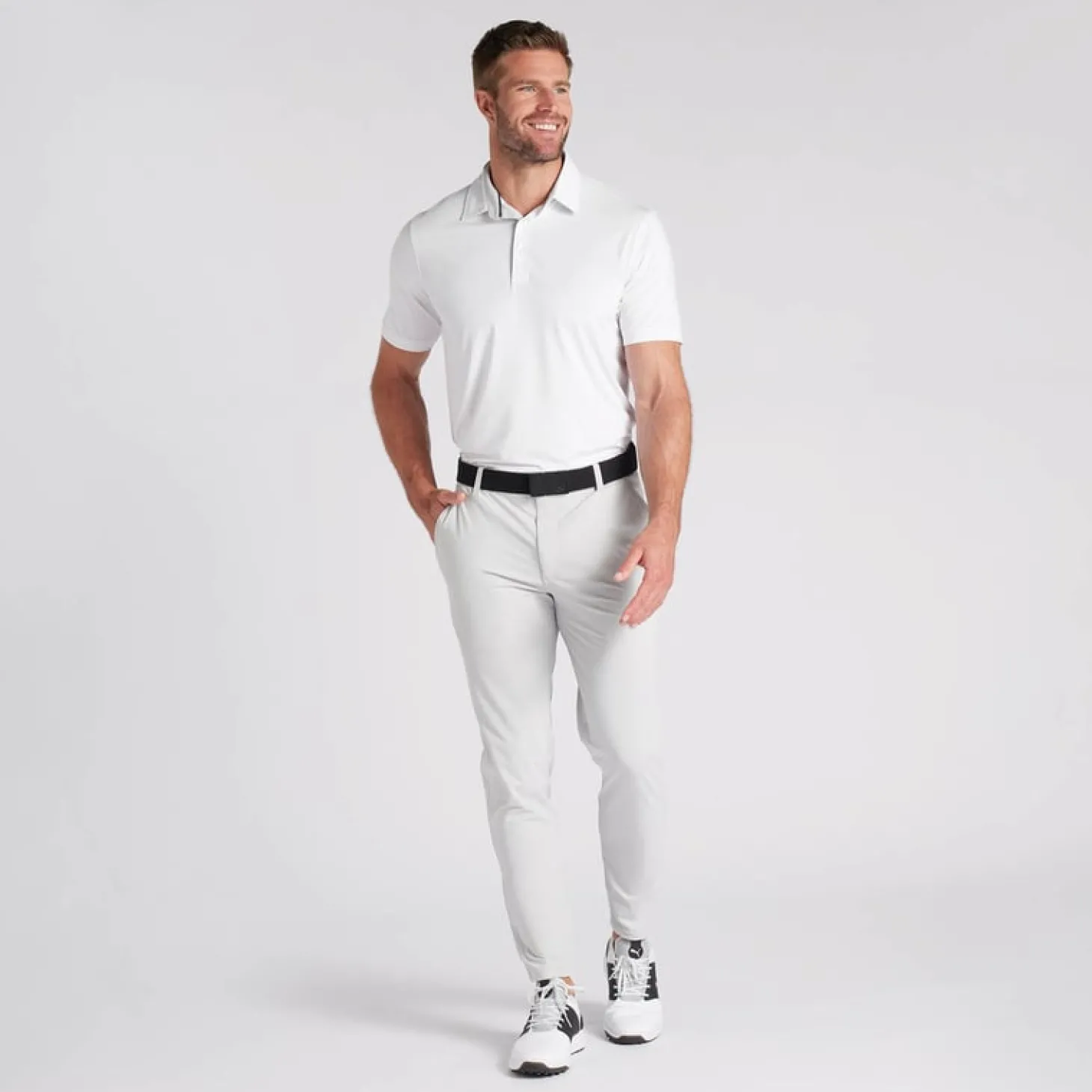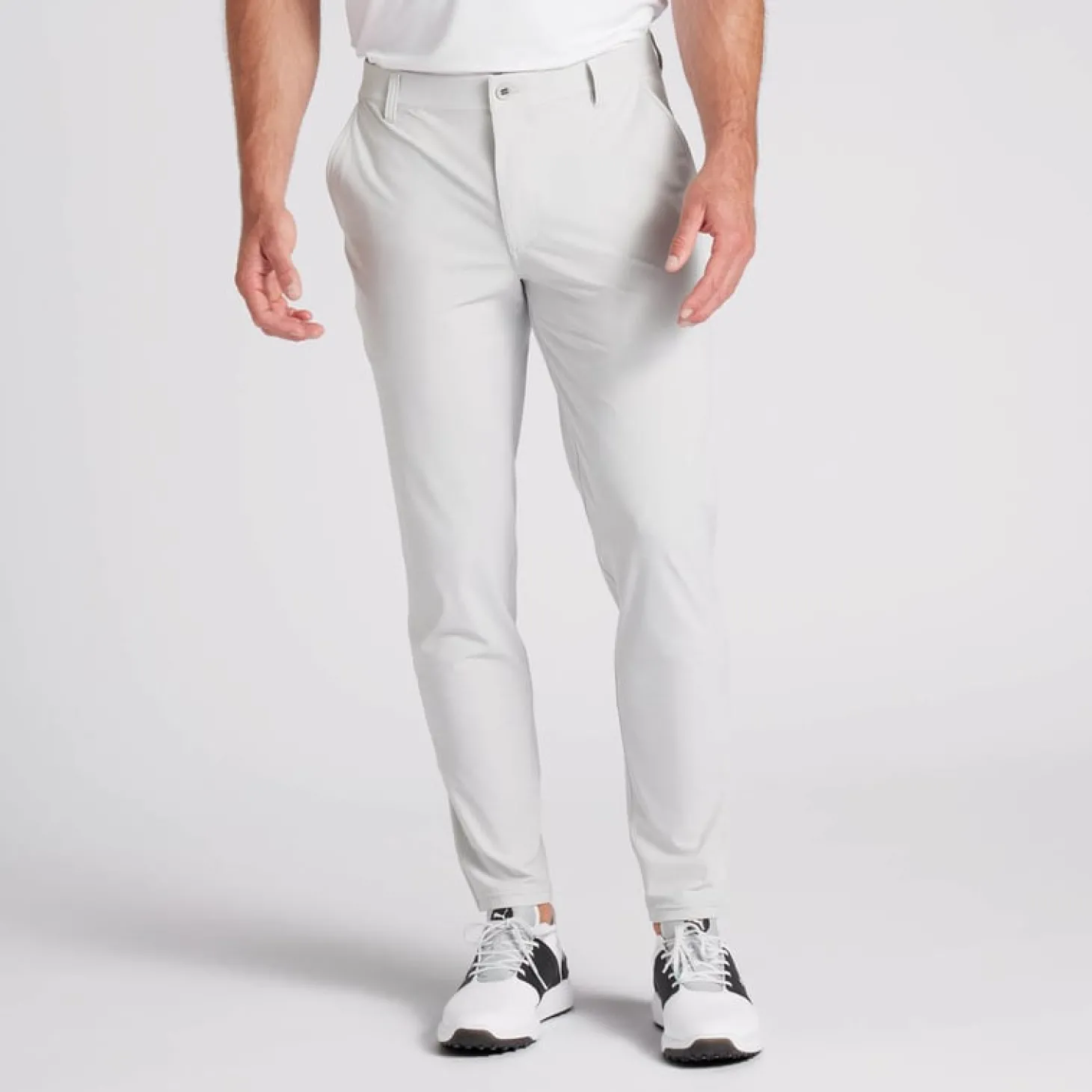 PUMA lanserar en riktig premiumbyxa där det italienska tunna, men fasta, tyget är stickat istället för vävt. Det ger en fantastisk stretch och en byxa som är sval även när det är varmt. Det finns en risk att du aldrig kommer att vilja ha några andra byxor efter att ha provat dessa. Jeansstil på de runda framfickorna, egen liten ficka för markeringsknappen samt tre bakfickor varav den ena har blixtlås så att du kan förvara ditt betalkort säkert. Lite tajtare passform.
