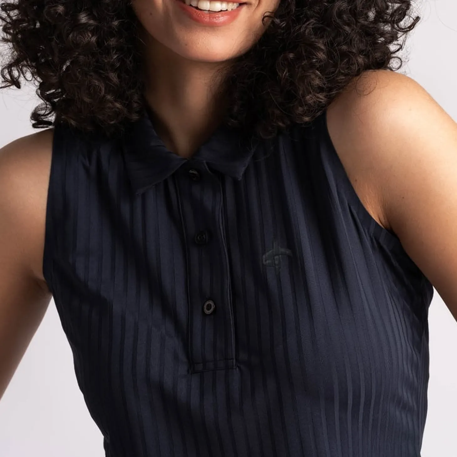 Andrea golfpolo är en lätt och stilren ärmlös pikétröja, designad för golfaren som vill kombinera modern design med funktion och hållbarhet. Tillverkad i ett unikt jacquardstickat ribbmaterial har polon ett elegant ”draperat” utseende med stretch som ger utmärkt rörelsefrihet – perfekt för varma dagar på golfbanan.Kragen är tillverkad i samma material som tröjan och har en knappslå framtill, vilket skapar en klassisk och tidlös look. Den figursydda konstruktionen vid ärmhålet ger en smickrande passform och maximal komfort, vilket gör att polon passar lika bra på banan som vid sociala tillställningar efter spelet.Polon är tillverkad av återvunnen polyester, som framställs genom att smälta ner befintlig plast – som fiskenät och plastflaskor – och omvandla det till nya, hållbara polyesterfibrer. Detta gör Andrea golfpolo till ett medvetet val för den miljömedvetna golfaren som inte vill kompromissa med varken stil eller funktion.