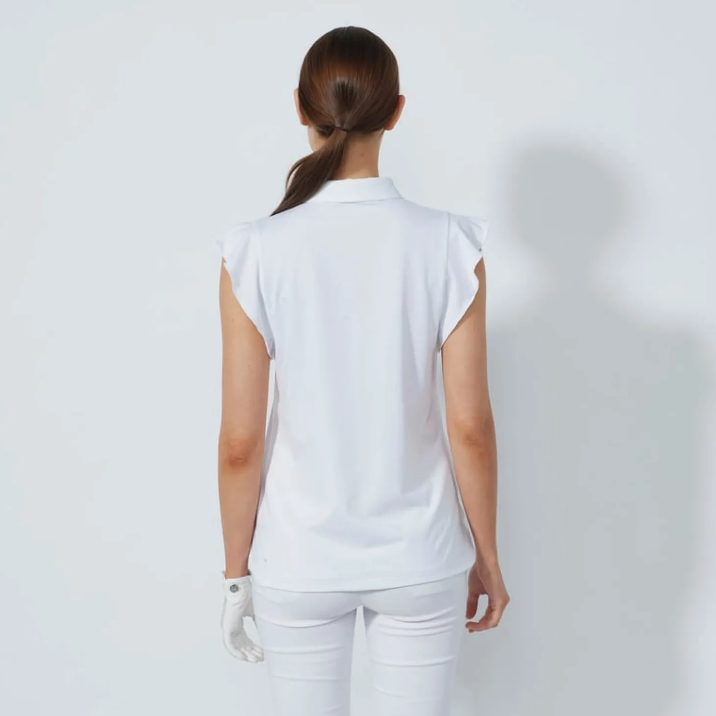 Tillverkad i ett stretchigt och snabbtorkande material med 85 % polyester och 15 % elastan som effektivt transporterar bort fukt. Den lediga passformen tillsammans med holkärm och volangdetaljer ger en luftig och stilren look. Knäppningen framtill adderar en klassisk touch. En bekväm och elegant ärmlös topp för golfare som vill ha både stil och funktion i värmen.