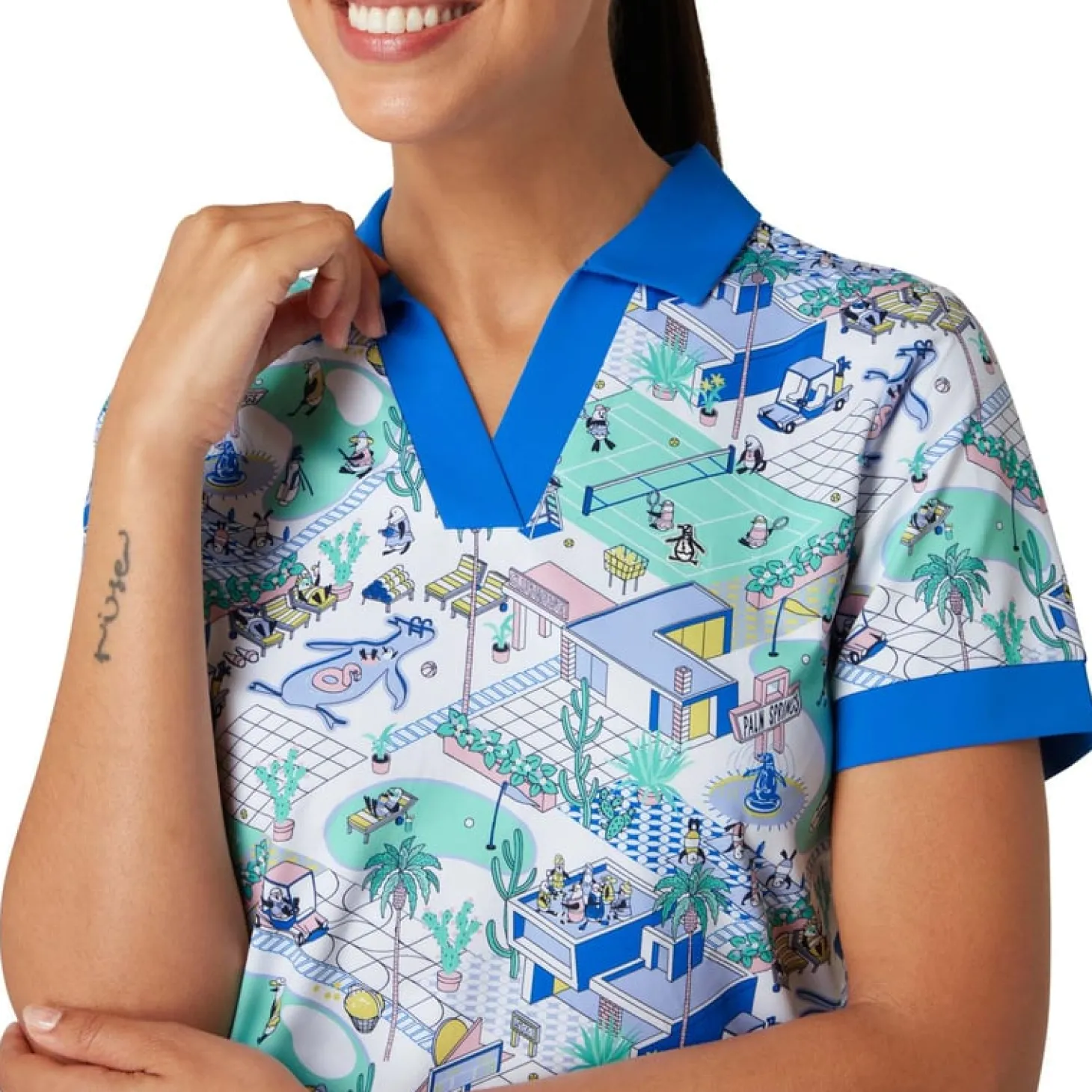 Ge din golfstil en färgstark och modern touch med denna golfpolo från Original Penguin, designad med ett ögonfallande Palm Springs-inspirerat mönster som ger en lekfull och stilren look på banan.Tillverkad i lätt single knit-tyg, erbjuder pikén en luftig och bekväm känsla, medan det stretchiga materialet ger en flexibel passform som följer dina rörelser genom hela svingen. På varma dagar håller fukttransporterande egenskaper dig torr och fräsch, så att du kan fokusera på ditt spel.Med sin balans mellan funktionalitet, stil och komfort är denna Original Penguin golfpolo ett perfekt val för golfaren som vill sticka ut med både självförtroende och elegans.