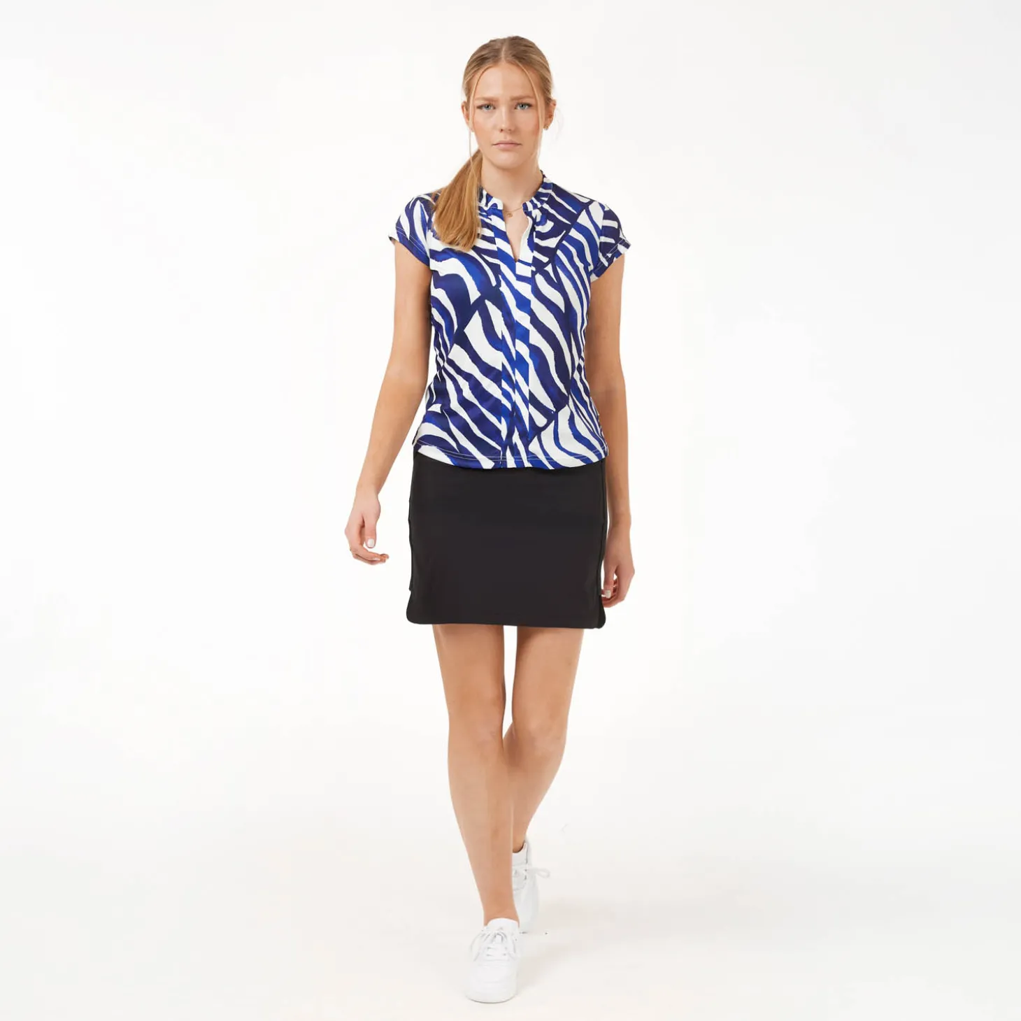 Mönstrad topp med kort ärm i ett luftigt funktionsmaterial med god andningsförmåga. Modellen har en liten ståkrage. Passformen är feminin men ej åtsmitande. Material: 100% Polyester.