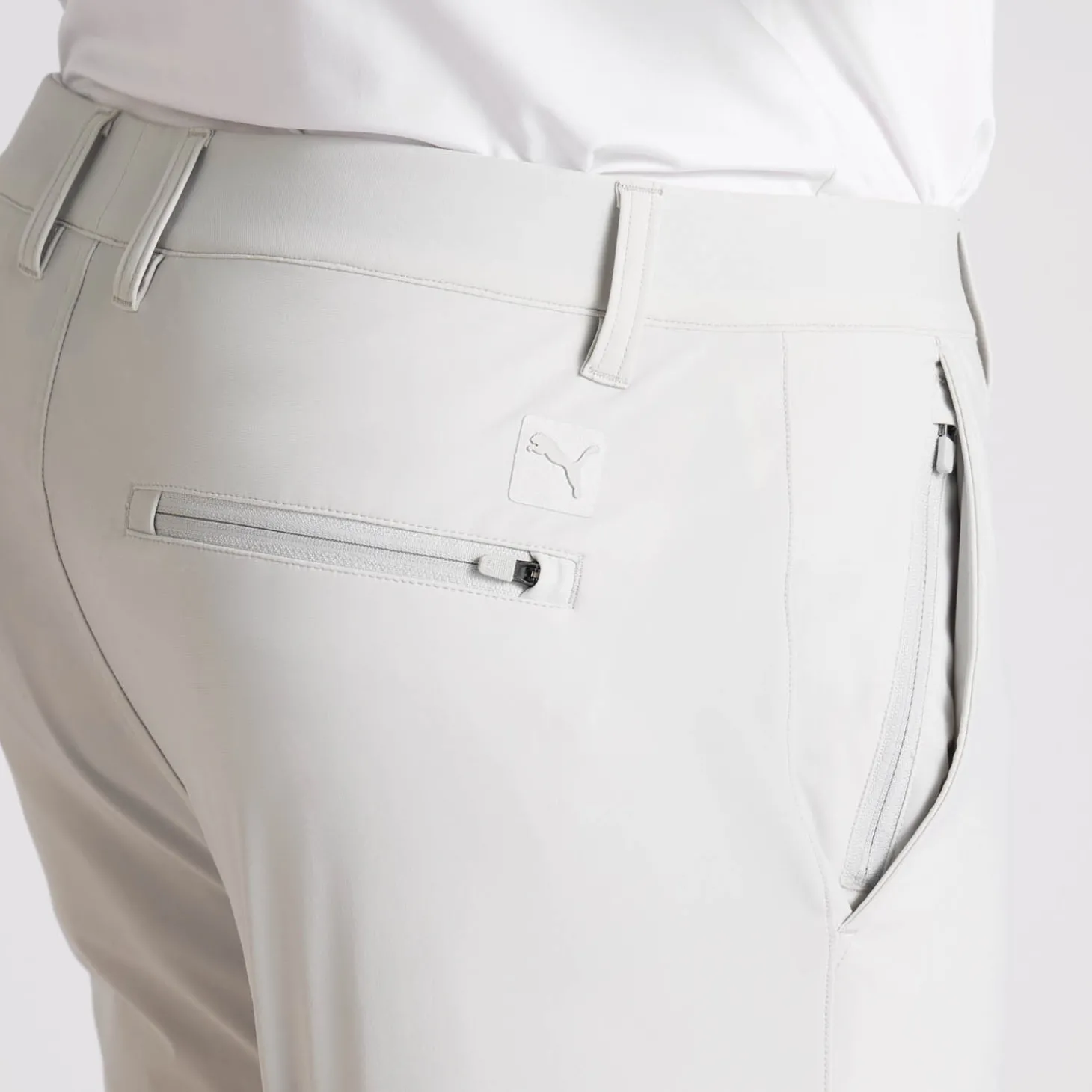 PUMA lanserar en riktig premiumbyxa där det italienska tunna, men fasta, tyget är stickat istället för vävt. Det ger en fantastisk stretch och en byxa som är sval även när det är varmt. Det finns en risk att du aldrig kommer att vilja ha några andra byxor efter att ha provat dessa. Jeansstil på de runda framfickorna, egen liten ficka för markeringsknappen samt tre bakfickor varav den ena har blixtlås så att du kan förvara ditt betalkort säkert. Lite tajtare passform.