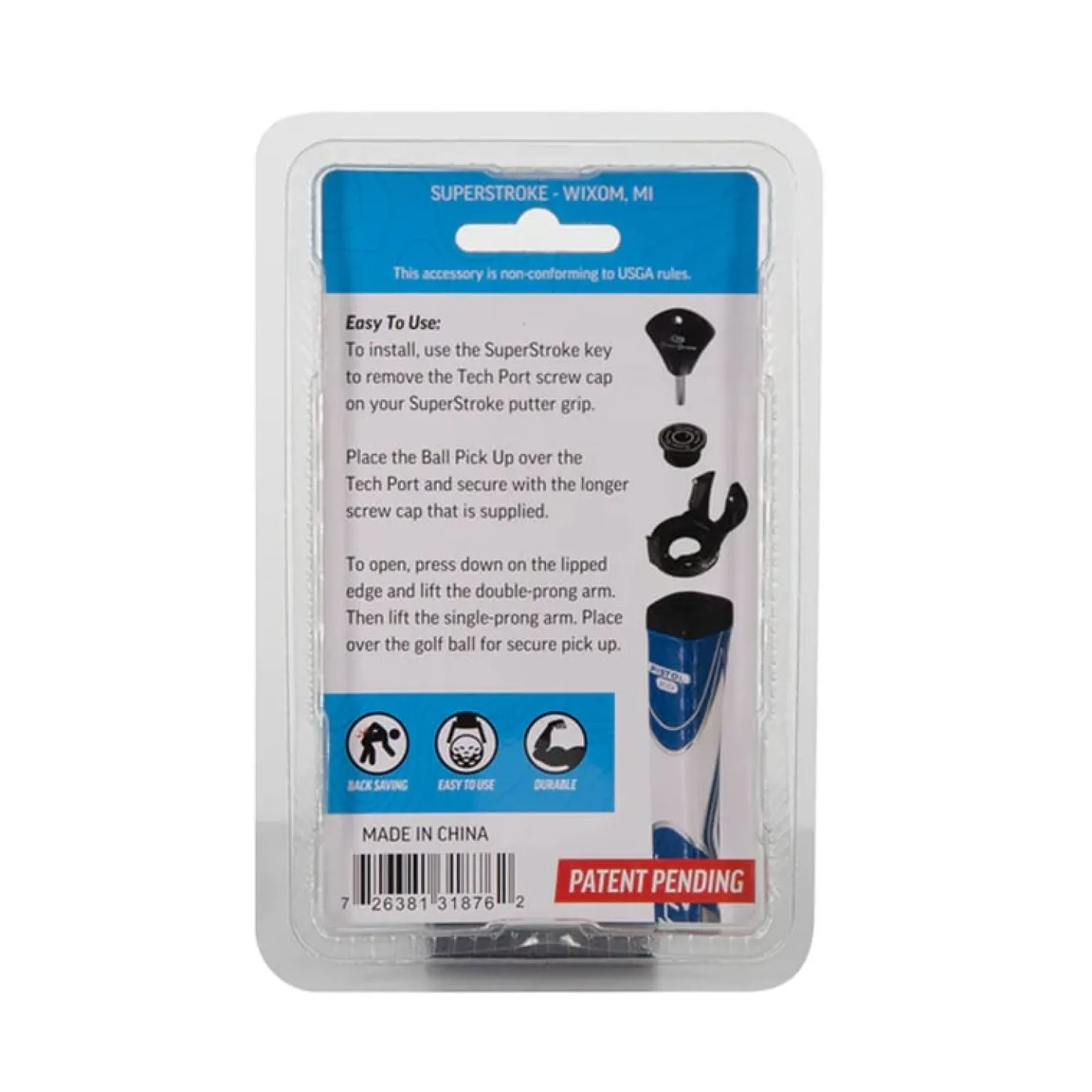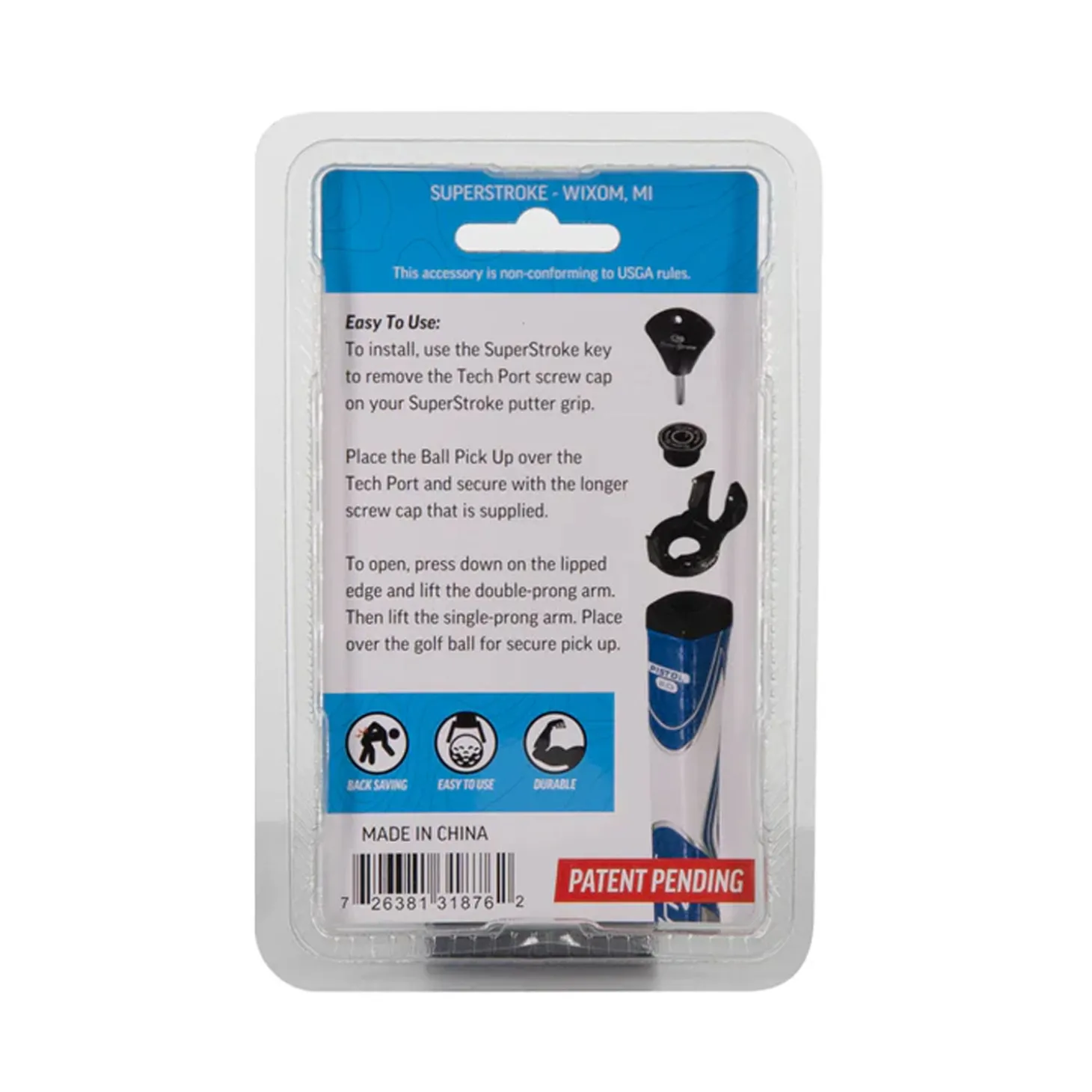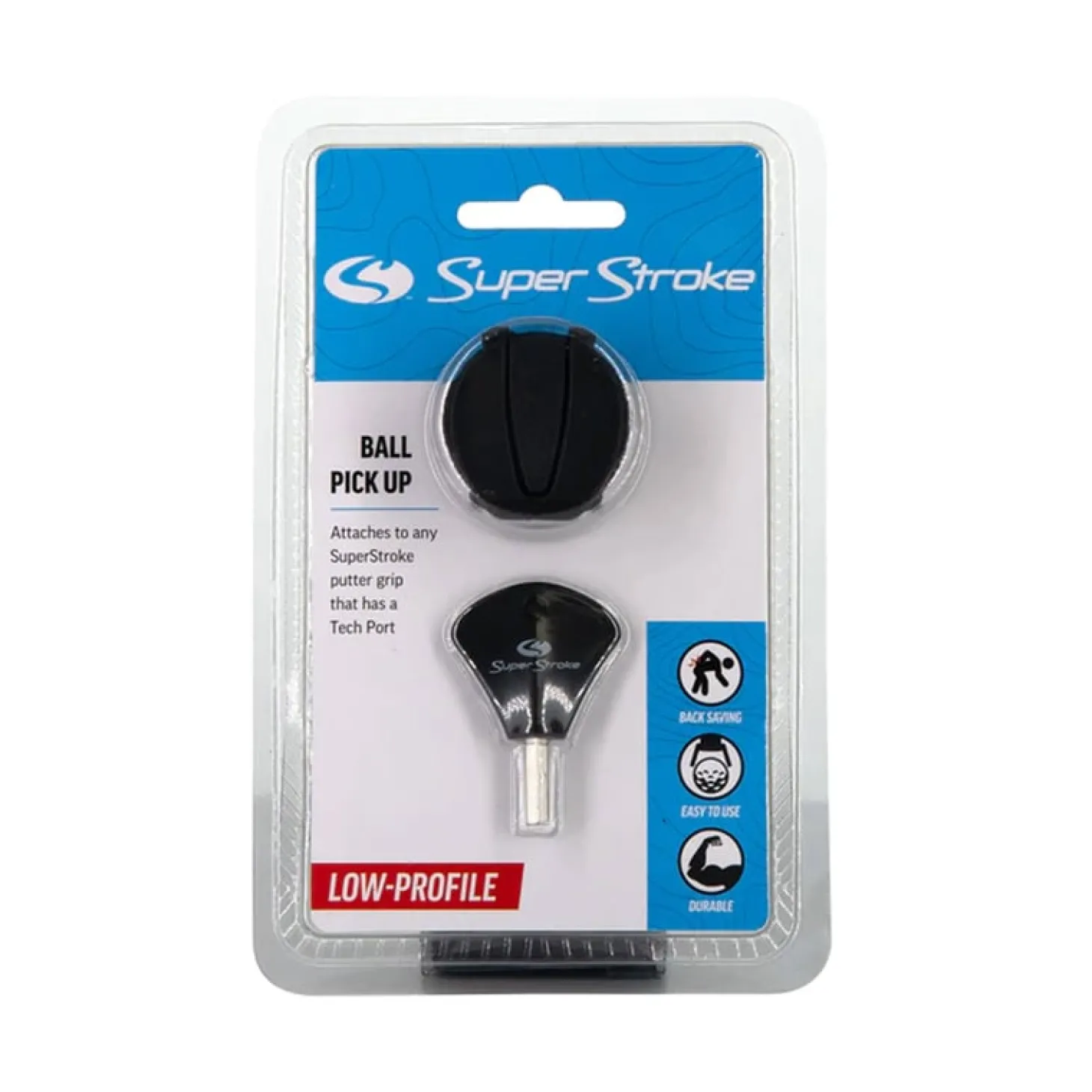 SuperStroke Ball Pick Up är otroligt enkel att använda. Placera helt enkelt den över din golfboll och tryck lite lätt. Tängerna kommer att greppa tag i bollen, vilket gör att du kan lyfta den och placera den i din ficka eller bollhållare. Ball Pick Up från SuperStroke är byggd för att hålla. Tillverkad med slitstarka material är detta tillbehör designat för att tåla slitage vid regelbunden användning på golfbanan. Oavsett om du är en helgkrigare eller en erfaren proffs, kommer denna bollhämtare vara ett pålitligt och långvarigt tillskott till din golfbag. Denna innovativa bollhämtare är designad för att smidigt fungera med SuperStroke-puttergrepp med en Tech Port. För att installera, använd SuperStroke-nyckeln för att ta bort Tech Port-skruvkorken på ditt SuperStroke-puttergrepp. Placera bollhämtaren över Tech Port och säkra den med bollhämtarens skruvkork (ingår). För att öppna, tryck ner på den kantade kanten och lyft den dubbla tandarmen. Lyft sedan den enkla tandarmen. Placera över golfbollen för ett säkert upphämtande. Ball Pick Up fungerar inte med en CounterWeight på följande modeller: WristLock, Tour 5.0 och Pistol 2.0.