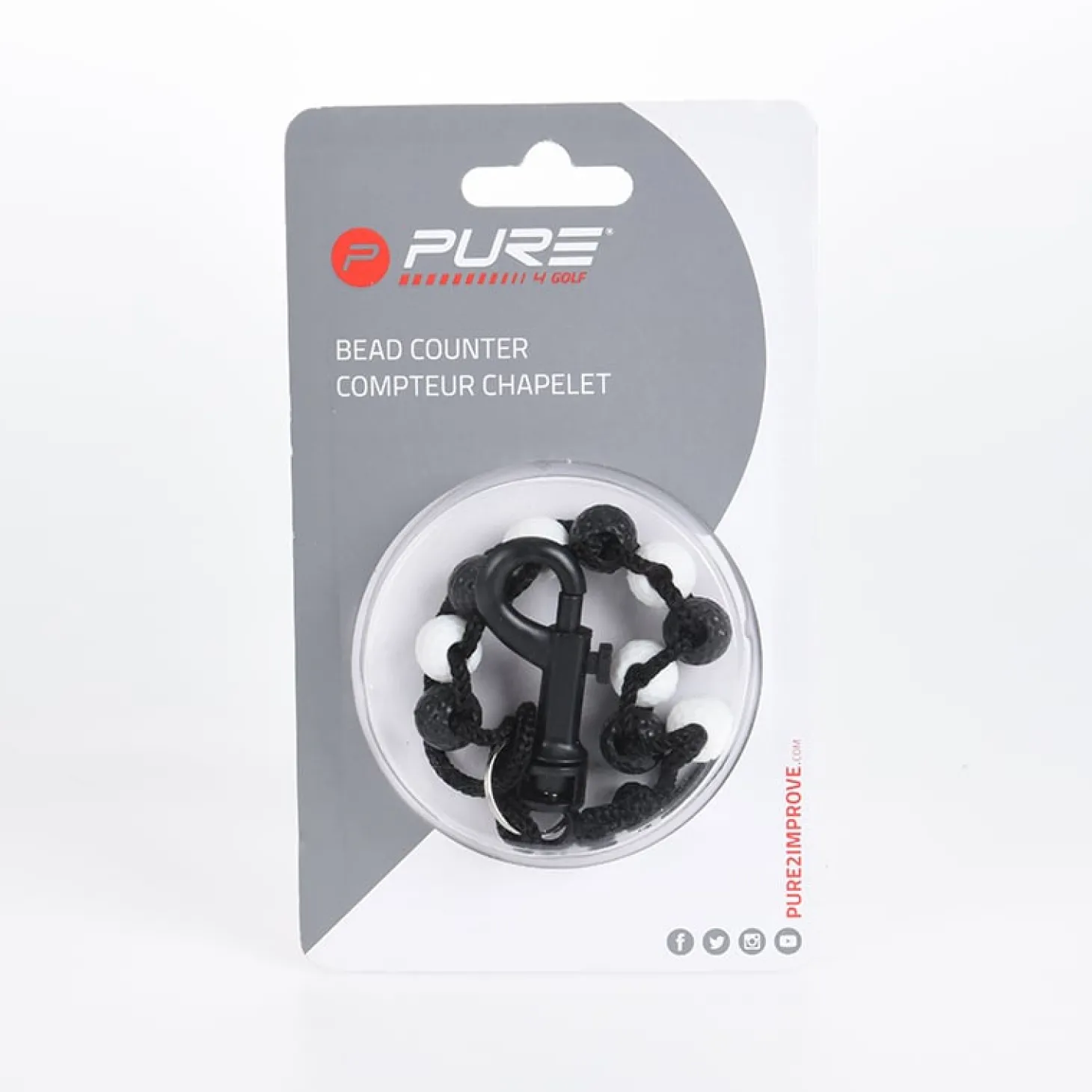 Radband som gör det enkelt att hålla koll på antal slag under golfrundan. Karbonhake gör det enkelt att fästa radbandet på golfbagen.