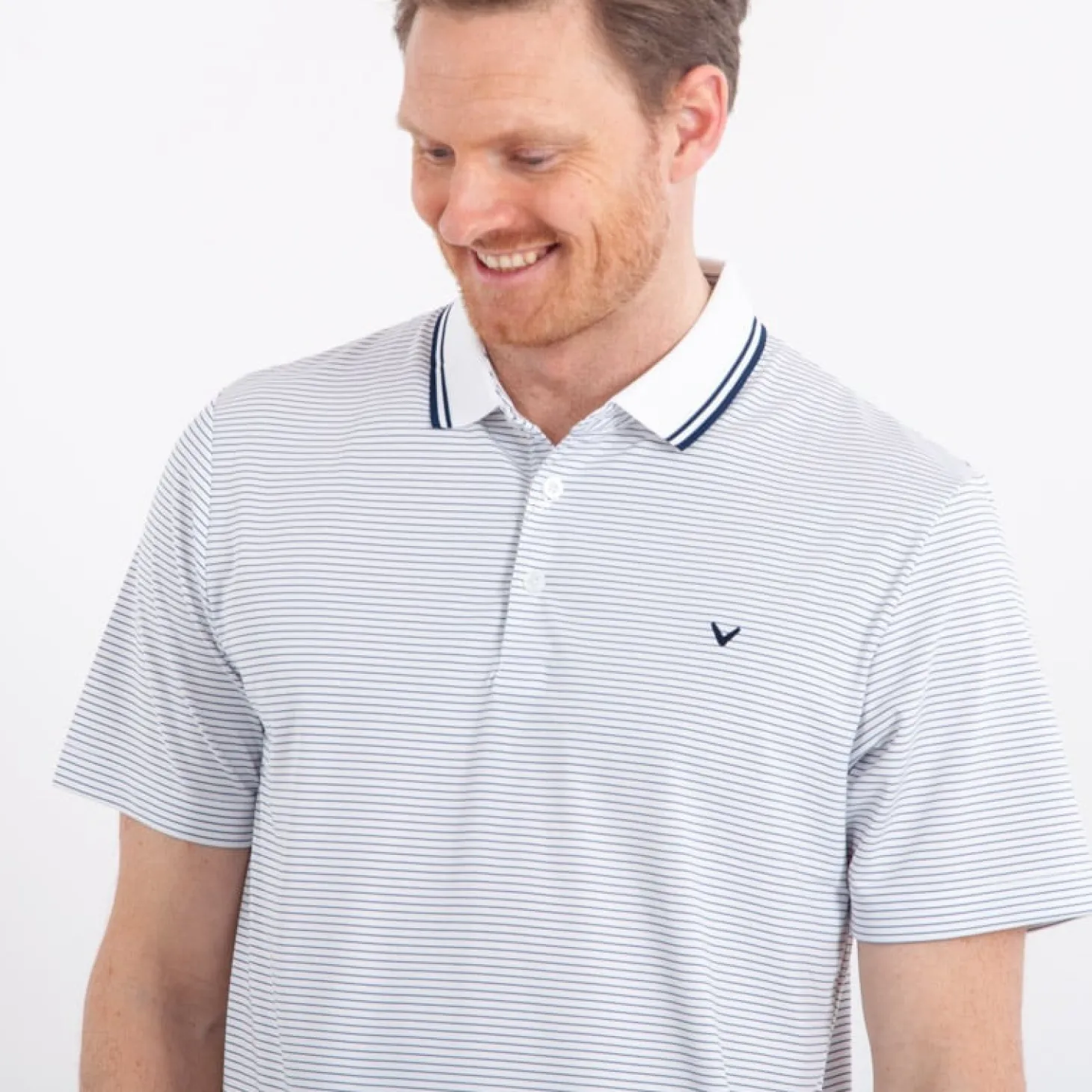 Funktionspiké med stretch och hög andningsförmåga. Diskreta ränder och Callawaylogga på vänster bröst. 100% polyester.
