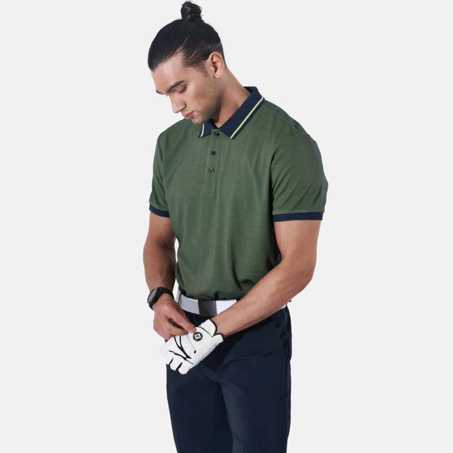 Rye polo är en piké tillverkad i en stretchig polyesterkvalité. Tyget har en god andningsförmåga och leder bort fukt. Tyget är småmönstrat som syns på nära håll, men på lite avstånd ser den mer melerad ut. Vanlig krage som har en rand i kontrastfärg och i mitten framtill finns tre knappar. Material: 100% polyester.